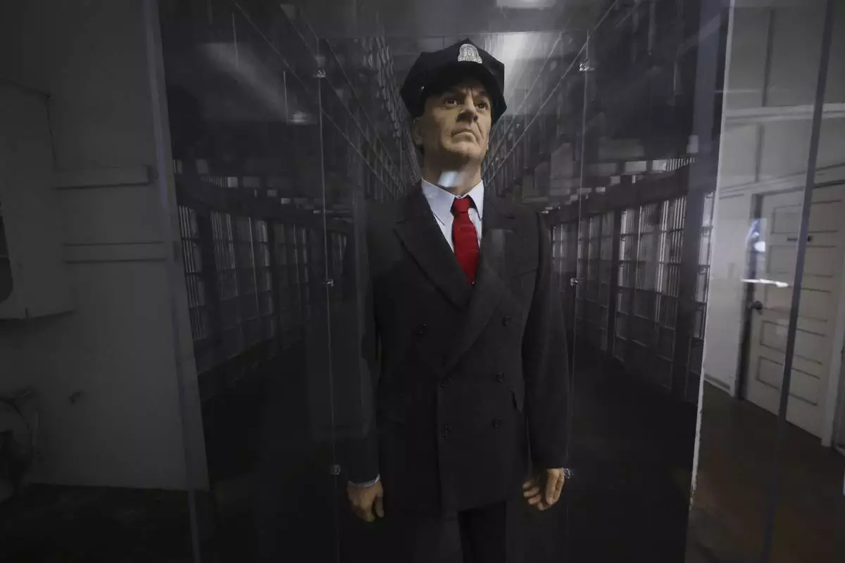 A mannequin is dressed as a prison guard as visitors tour Alcatraz Island Monday, May 5, 2025, in San Francisco. (AP Photo/Jed Jacobsohn)