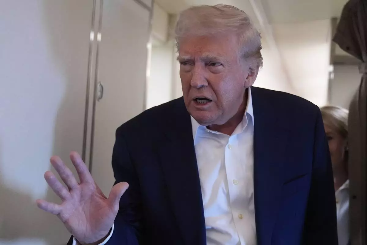 President Donald Trump talks with reporters on Air Force One as he heads back to Washington, Sunday, May 4, 2025, from West Palm Beach, Fla. (AP Photo/Manuel Balce Ceneta)