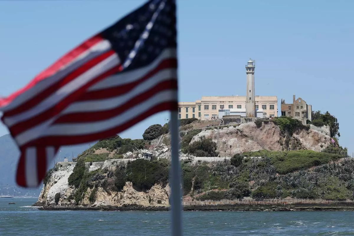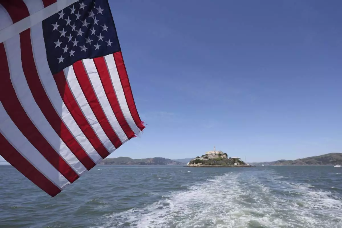 An American flag flies on the back of a ferry in front of Alcatraz Island in San Francisco, Monday, May 5, 2025. (AP Photo/Jed Jacobsohn)
