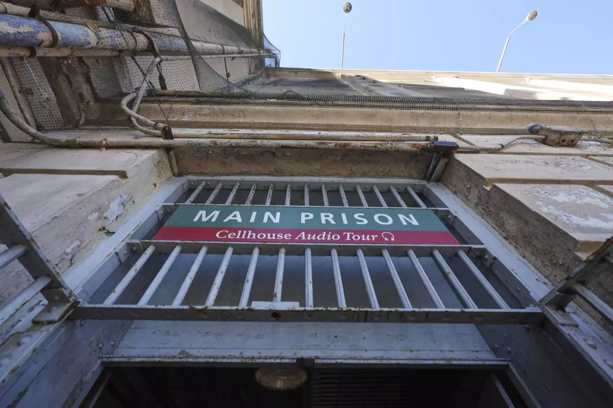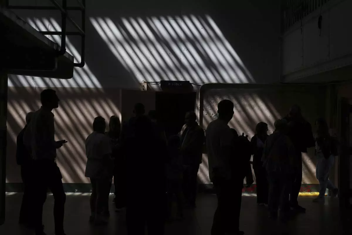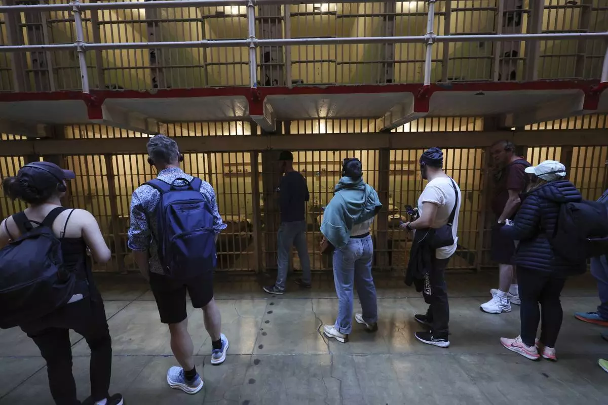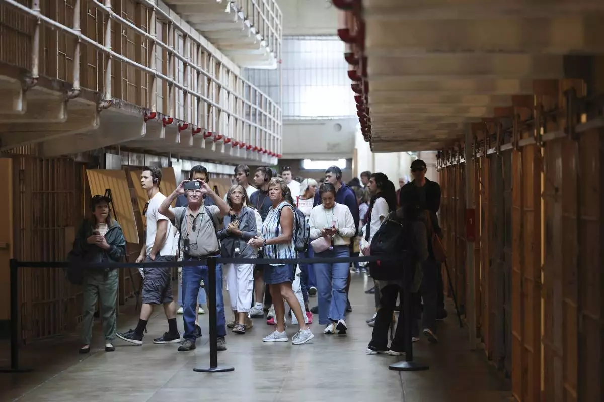 FILE - People tour the main cell house on Alcatraz Island in San Francisco, March 15, 2021, as the historic island prison was reopened to visitors after being closed since Dec. 2020, because of the coronavirus threat. (AP Photo/Eric Risberg, File)