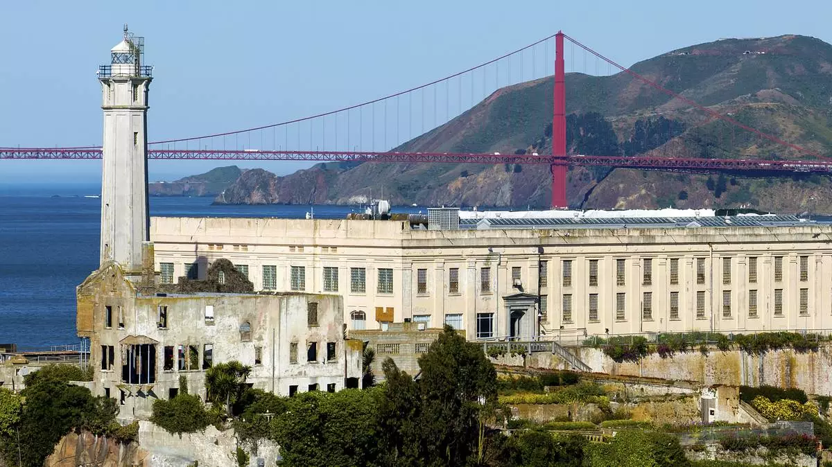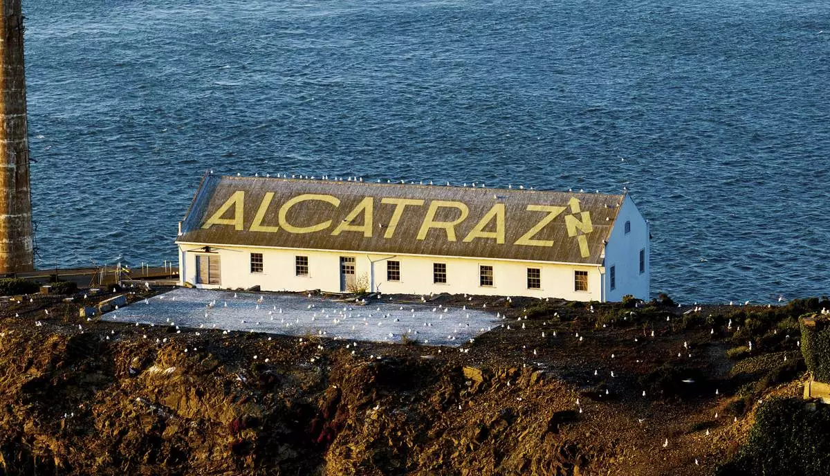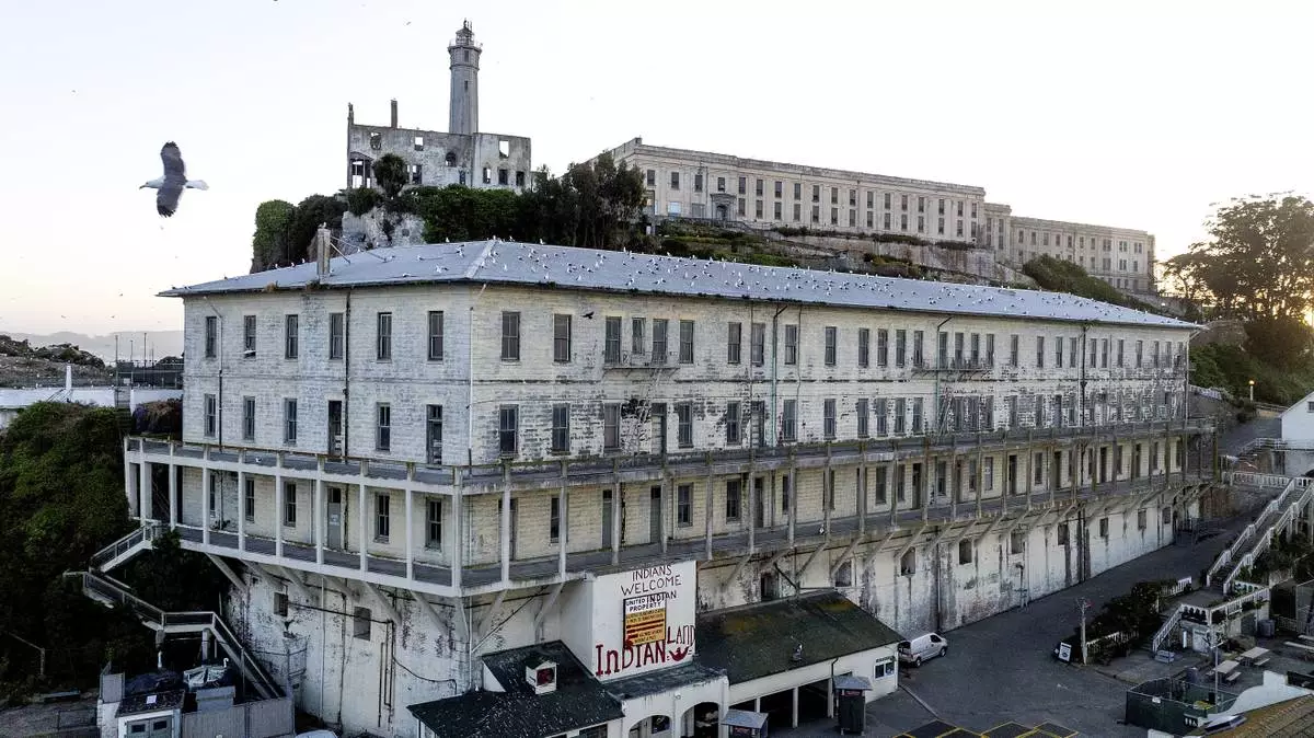 A building stands on Alcatraz Island on Sunday, May 4, 2025, in the San Francisco Bay, Calif. (AP Photo/Noah Berger)