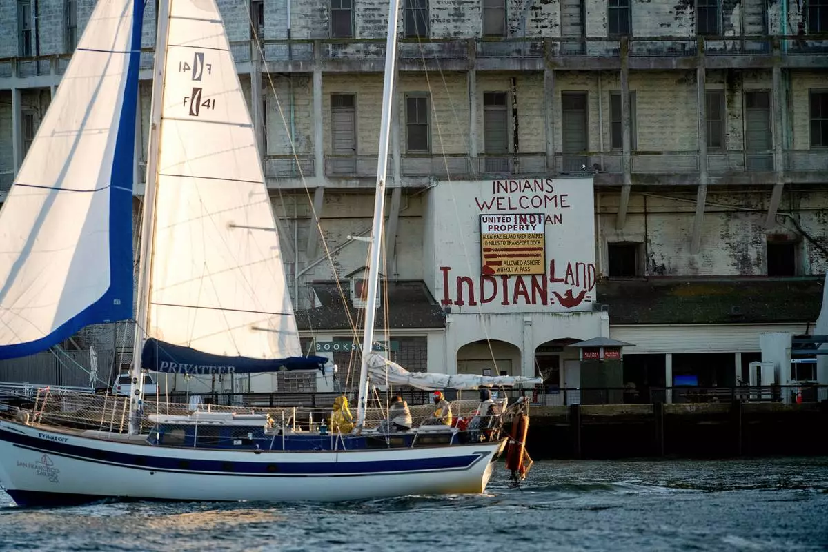 A sailboat passes Alcatraz Island on Sunday, May 4, 2025, in the San Francisco Bay, Calif. (AP Photo/Noah Berger)