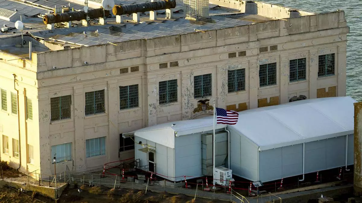 The entrance to the main prison on Alcatraz Island is shown Monday, May 5, 2025, in San Francisco. (AP Photo/Jed Jacobsohn)