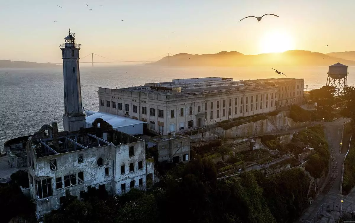With the Golden Gate Bridge in behind, Alcatraz Island is pictured on Sunday, May 4, 2025, in the San Francisco Bay, Calif. (AP Photo/Noah Berger)