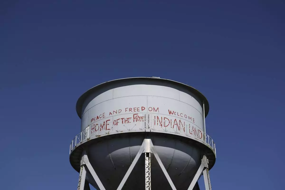 A water tower stands at Alcatraz Island on Sunday, May 4, 2025, in the San Francisco Bay, Calif. (AP Photo/Noah Berger)