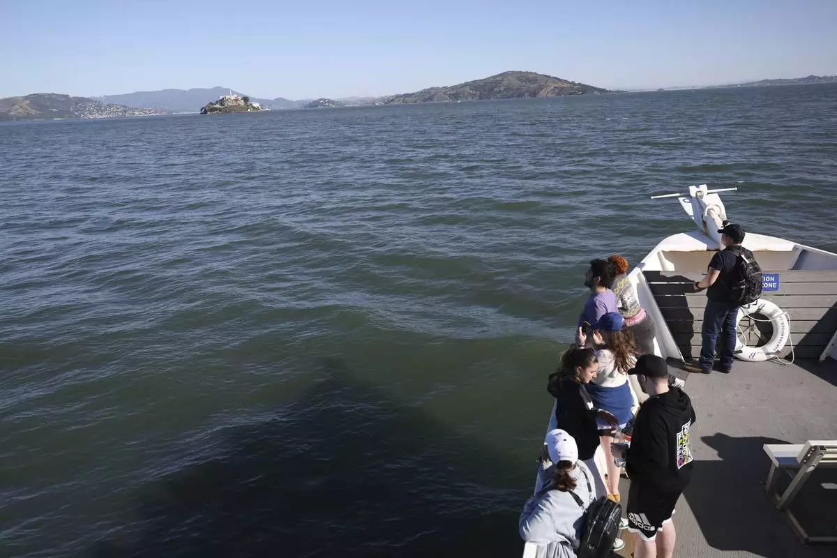 Visitors view Alcatraz Island from a tour boat Monday, May 5, 2025, in San Francisco. (AP Photo/Jed Jacobsohn)