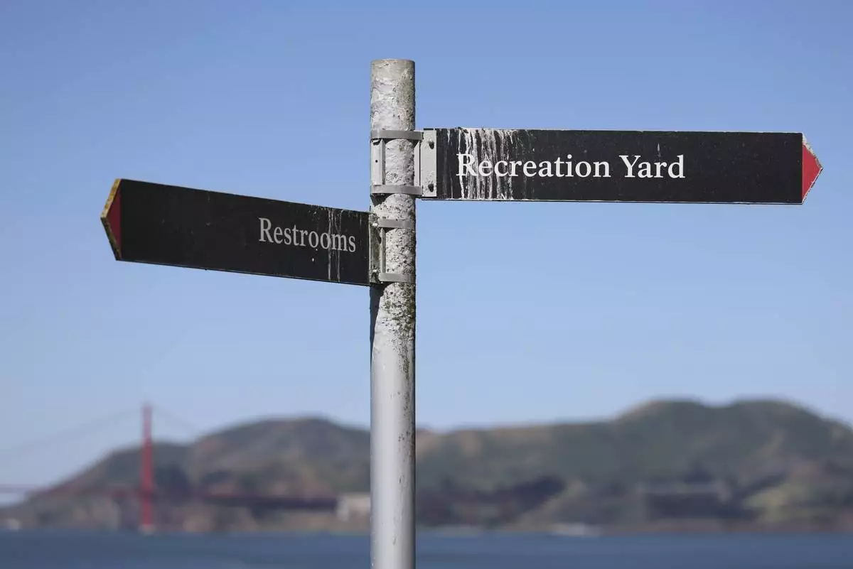 A sign points to the recreation yard on Alcatraz Island Monday, May 5, 2025, in San Francisco. (AP Photo/Jed Jacobsohn)