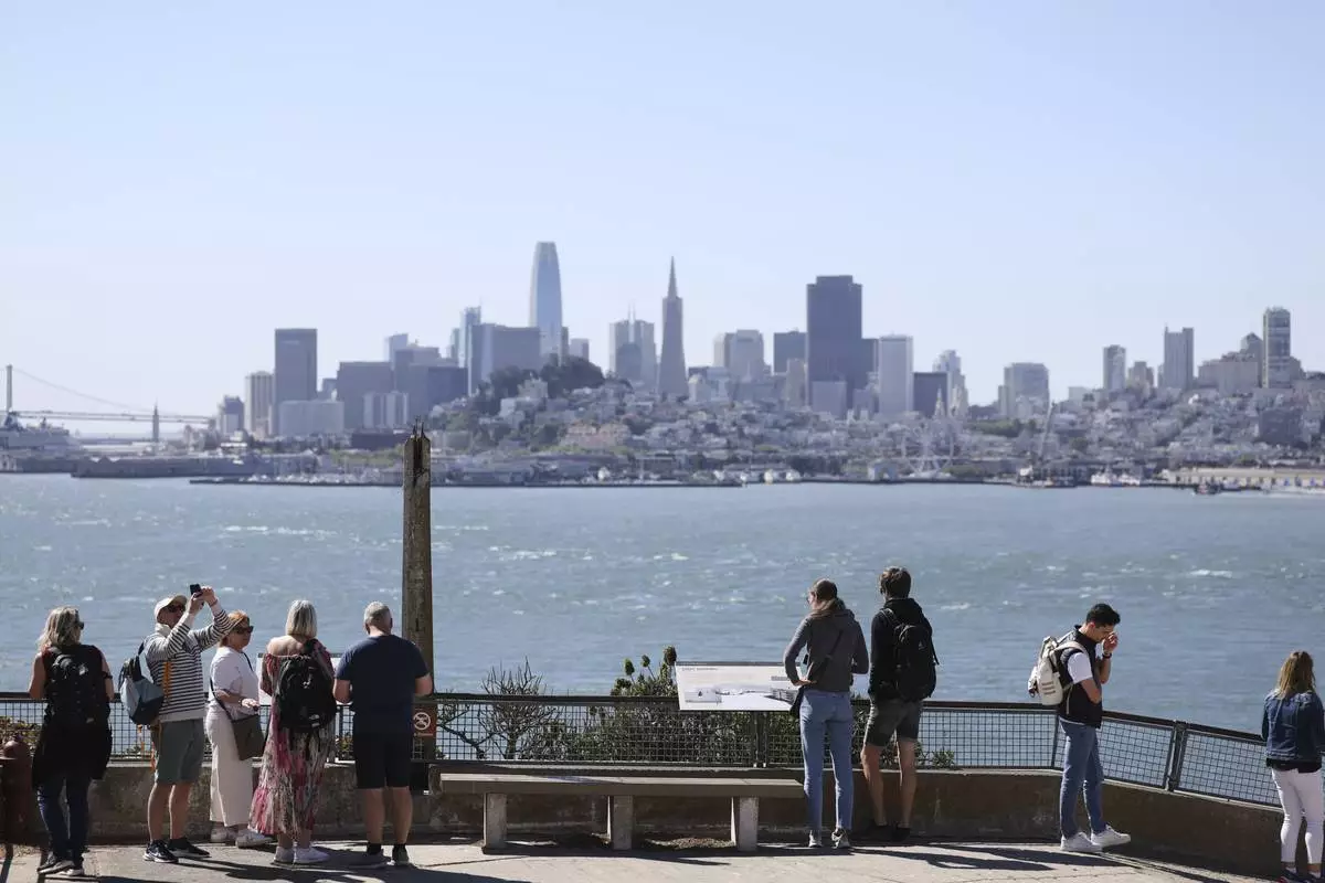 Visitors view the downtown skyline from Alcatraz Island Monday, May 5, 2025, in San Francisco. (AP Photo/Jed Jacobsohn)