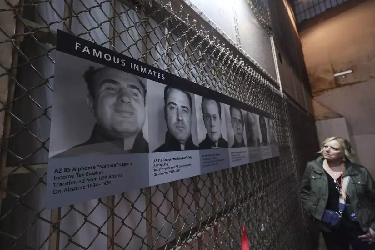 A visitor views pictures of famous inmates on Alcatraz Island Monday, May 5, 2025, in San Francisco. (AP Photo/Jed Jacobsohn)
