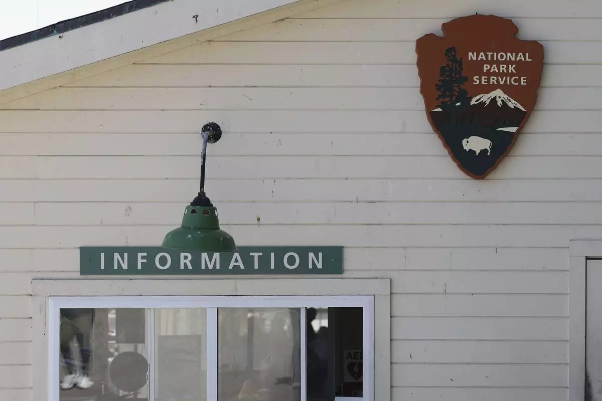 A National Park Service sign is shown above an Information booth during a tour of Alcatraz Island in San Francisco, Monday, May 5, 2025. (AP Photo/Jed Jacobsohn)