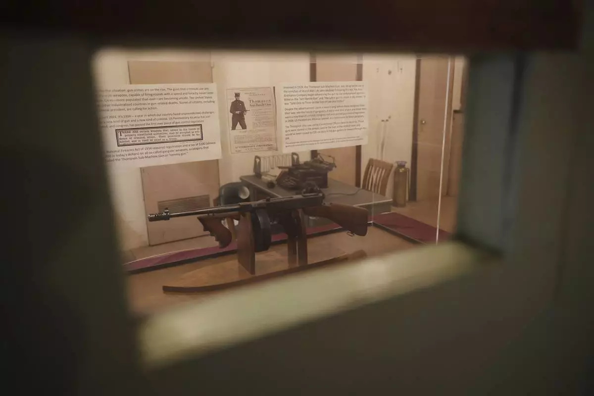 The Thompson Anti-Bandit Gun, used by correction officers in the prison, is displayed on Alcatraz Island Monday, May 5, 2025, in San Francisco. (AP Photo/Jed Jacobsohn)