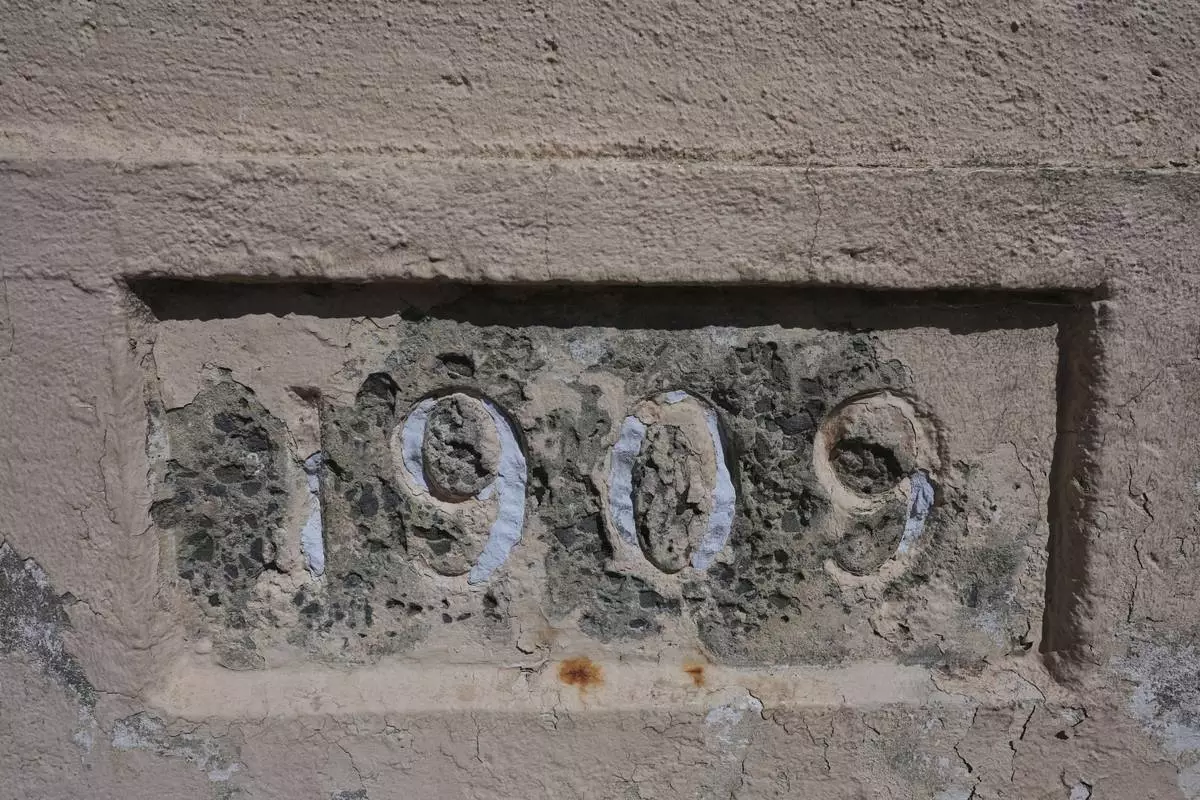 The year 1909 is carved on a wall on Alcatraz Island, Monday, May 5, 2025, in San Francisco. (AP Photo/Jed Jacobsohn)