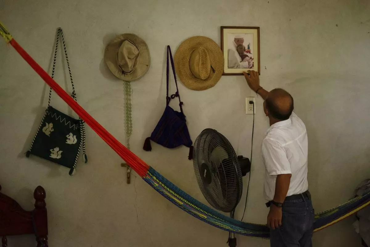 Tsotsil priest Sebastian Lopez shows a portrait of himself with Pope Francis taken during a papal visit to Chiapas state in 2016, in Huitiupan, Mexico, Sunday, April 27, 2025. (AP Photo/Isabel Mateos)