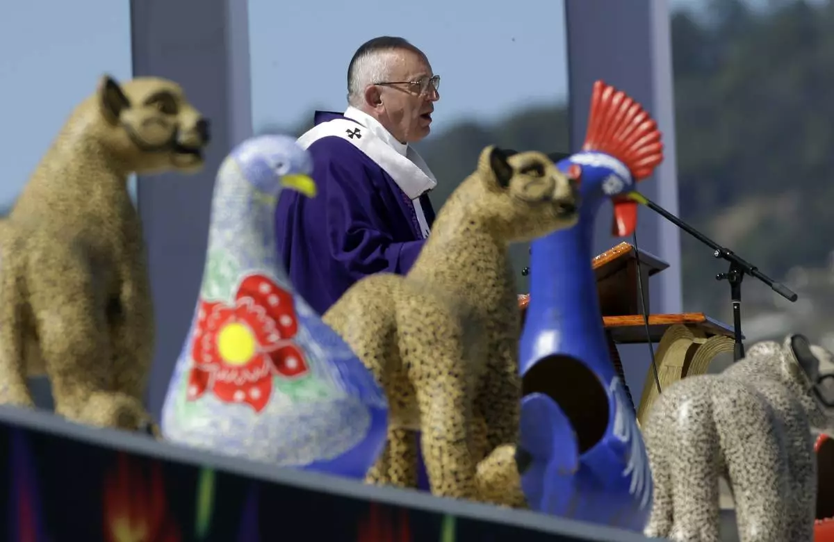 FILE - Pope Francis delivers his message during an outdoor Mass, on a stage adorned with pottery depicting species indigenous to the area, in San Cristobal de las Casas, in the Mexican state of Chiapas, Feb. 15, 2016. (AP Photo/Gregorio Borgia, File)