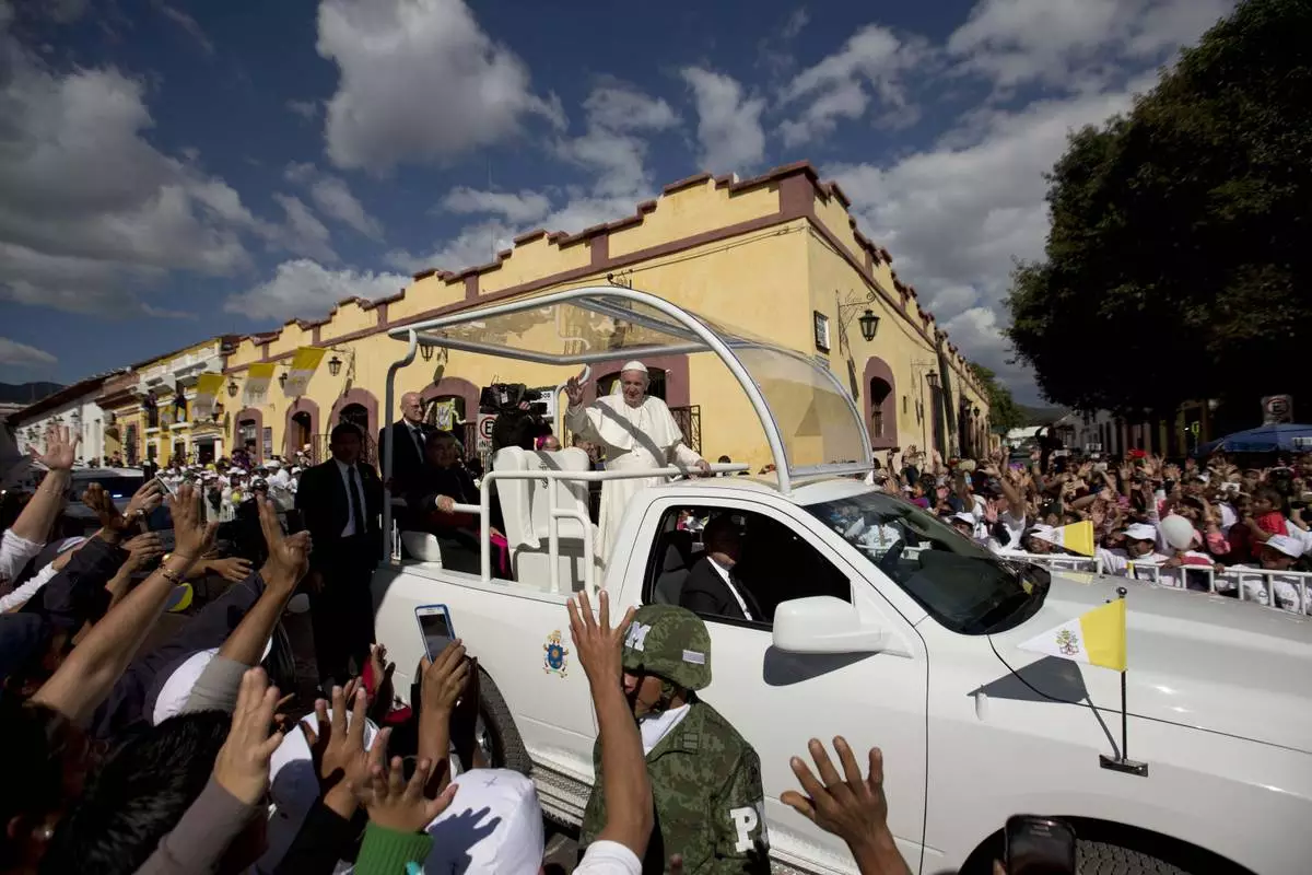 FILE - Pope Francis waves from his popemobile as he leaves the Cathedral in San Cristobal de las Casas, Mexico, Feb. 15, 2016. (AP Photo/Eduardo Verdugo, File)