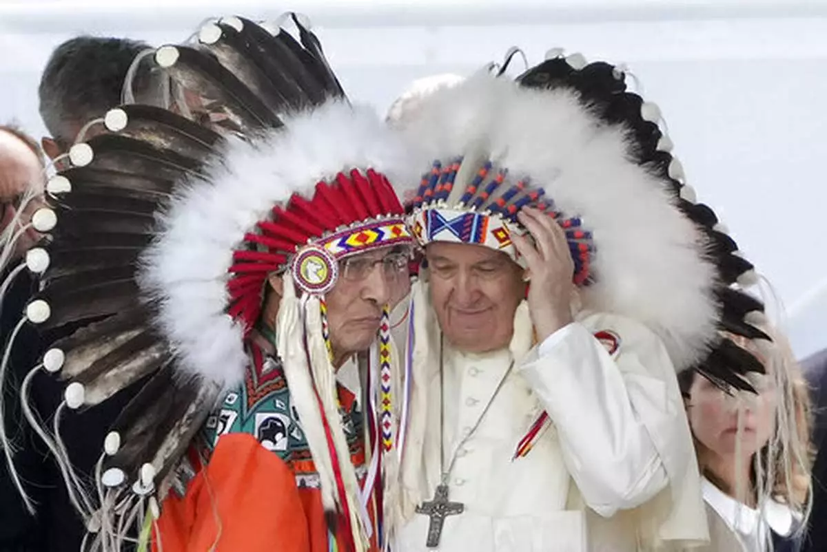 FILE - Pope Francis dons a headdress during a meeting with Indigenous communities, including First Nations, Metis and Inuit, at Our Lady of Seven Sorrows Catholic Church in Maskwacis, near Edmonton, Canada, July 25, 2022. (AP Photo/Gregorio Borgia, File)