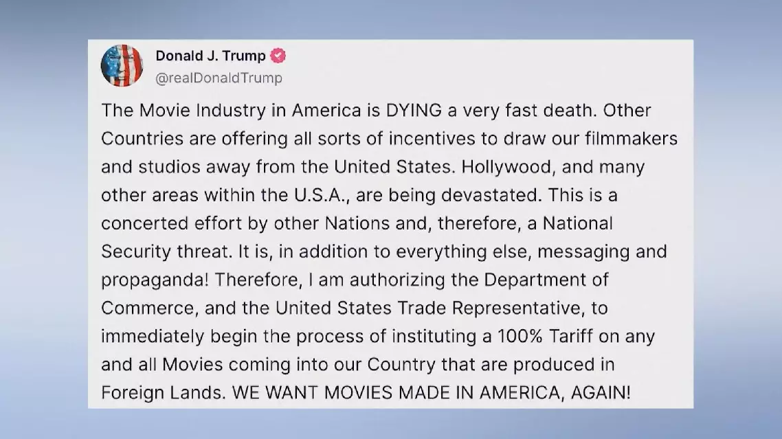 "Other countries are offering all sorts of incentives to draw our filmmakers and studios away from the United States. Hollywood, and many other areas within the U.S.A., are being devastated," Trump said in the post, calling the situation "a national security threat."