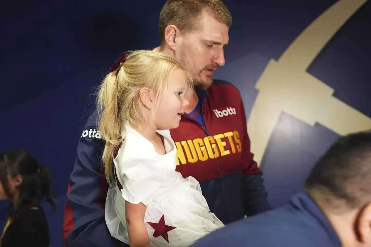 Denver Nuggets center Nikola Jokic holds his daughter after Game 7 of an NBA basketball first-round playoff series against the Los Angeles Clippers, Saturday, May 3, 2025, in Denver. (AP Photo/David Zalubowski)