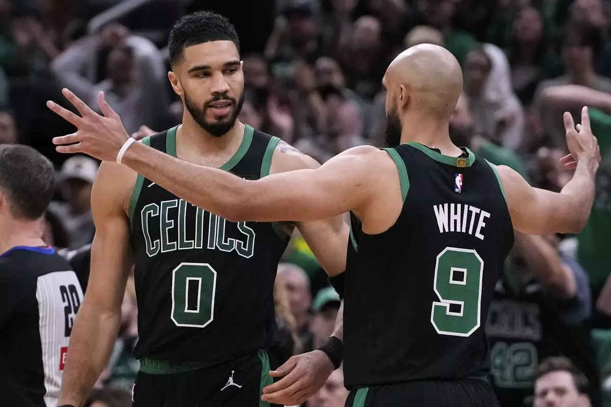 Boston Celtics forward Jayson Tatum (0) celebrates with teammate Derrick White while leading the Orlando Magic during the second half in Game 5 of a first-round NBA playoff basketball series, Tuesday, April 29, 2025, in Boston. (AP Photo/Charles Krupa)