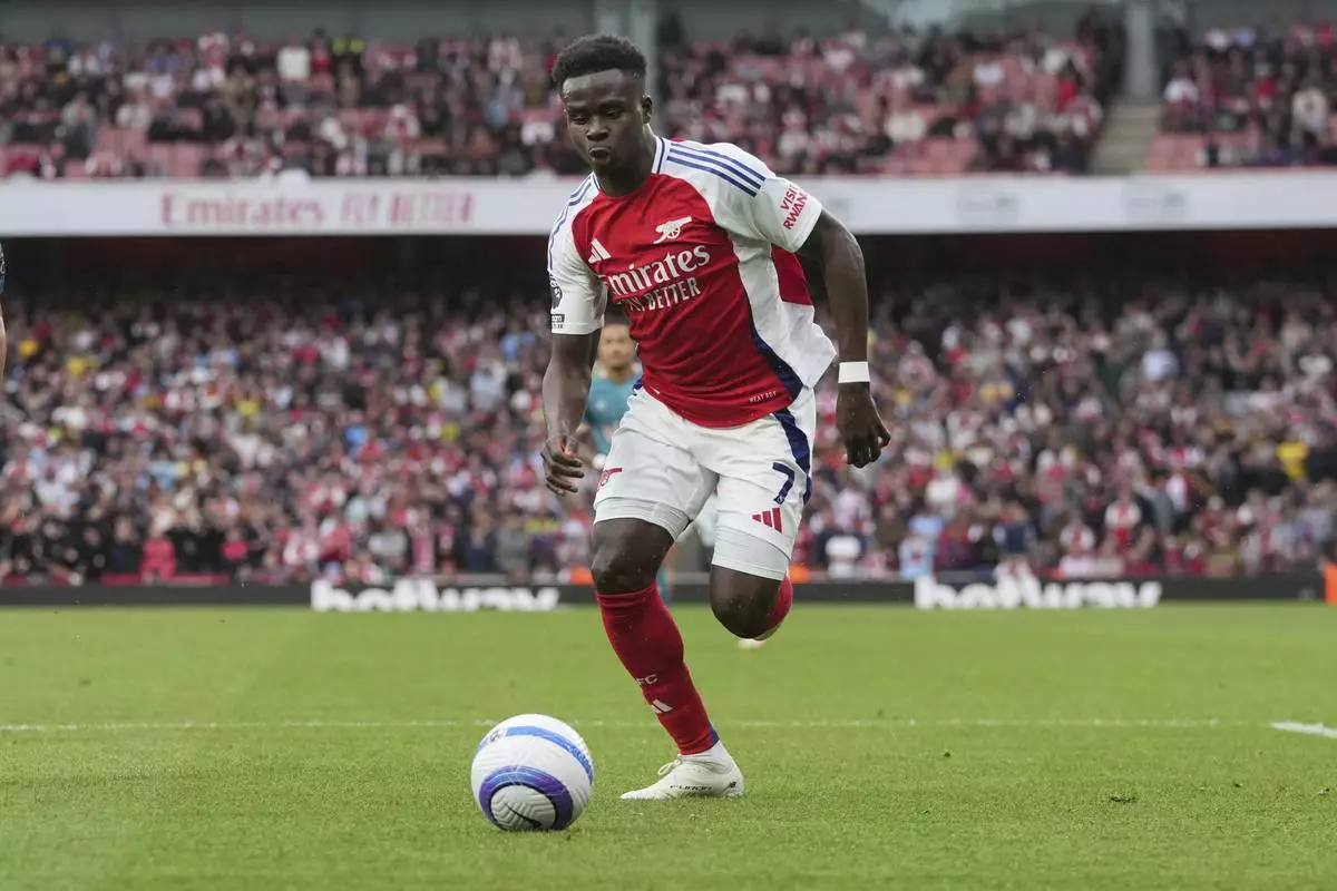 Arsenal's Bukayo Saka controls the ball during the English Premier League soccer match between Arsenal and Bournemouth at Emirates stadium in London, Saturday, May 3, 2025. (AP Photo/Kin Cheung)