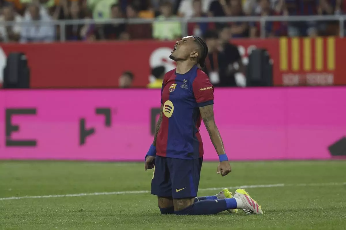 Barcelona's Raphinha reacts after a missed scoring opportunity during the Spanish Copa del Rey final soccer match between Barcelona and Real Madrid at Estadio de La Cartuja stadium in Seville, Spain, Saturday, April 26, 2025. (AP Photo/Joan Monfort)