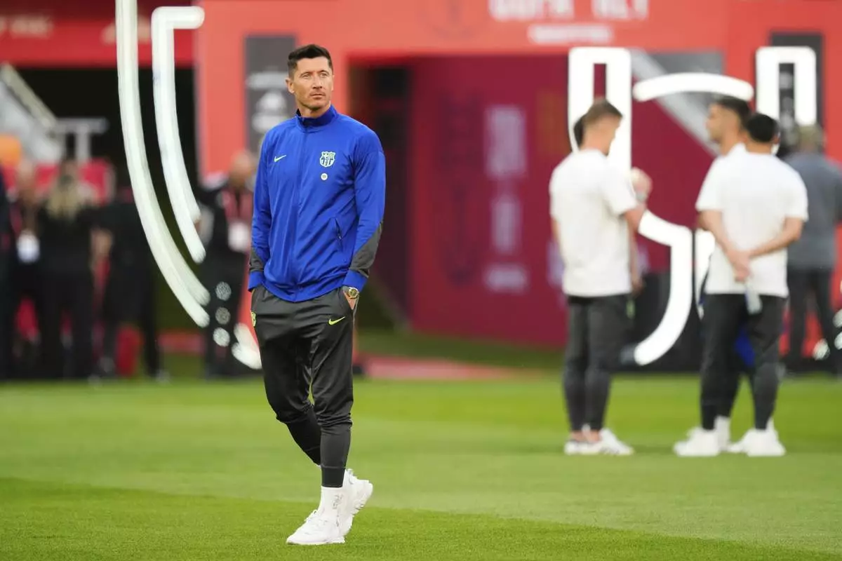 Barcelona's Robert Lewandowski walks on the pitch ahead of the Spanish Copa del Rey final soccer match between Barcelona and Real Madrid at Estadio de La Cartuja stadium in Seville, Spain, Saturday, April 26, 2025. (AP Photo/Jose Breton)
