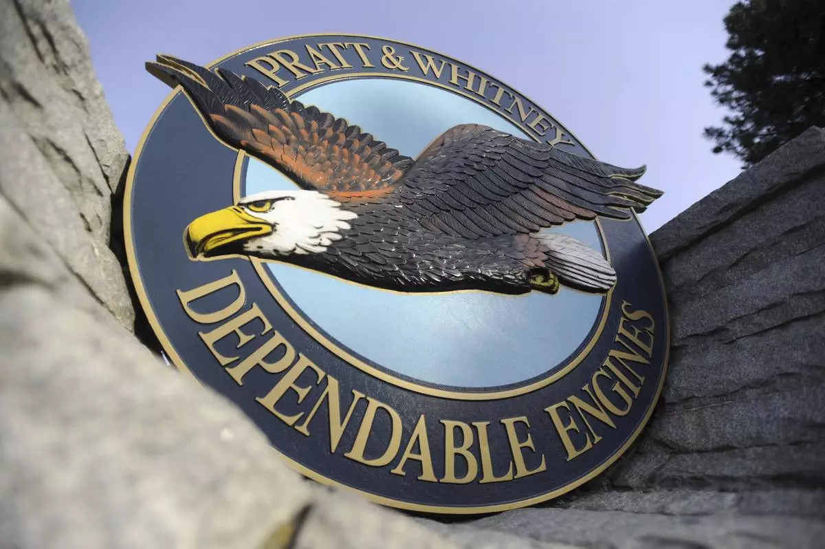 FILE - This file photo taken Feb. 5, 2010, shows a "Pratt & Whitney Dependable Engines" emblem at the plant in East Hartford, Conn. (AP Photo/Jessica Hil, filel)