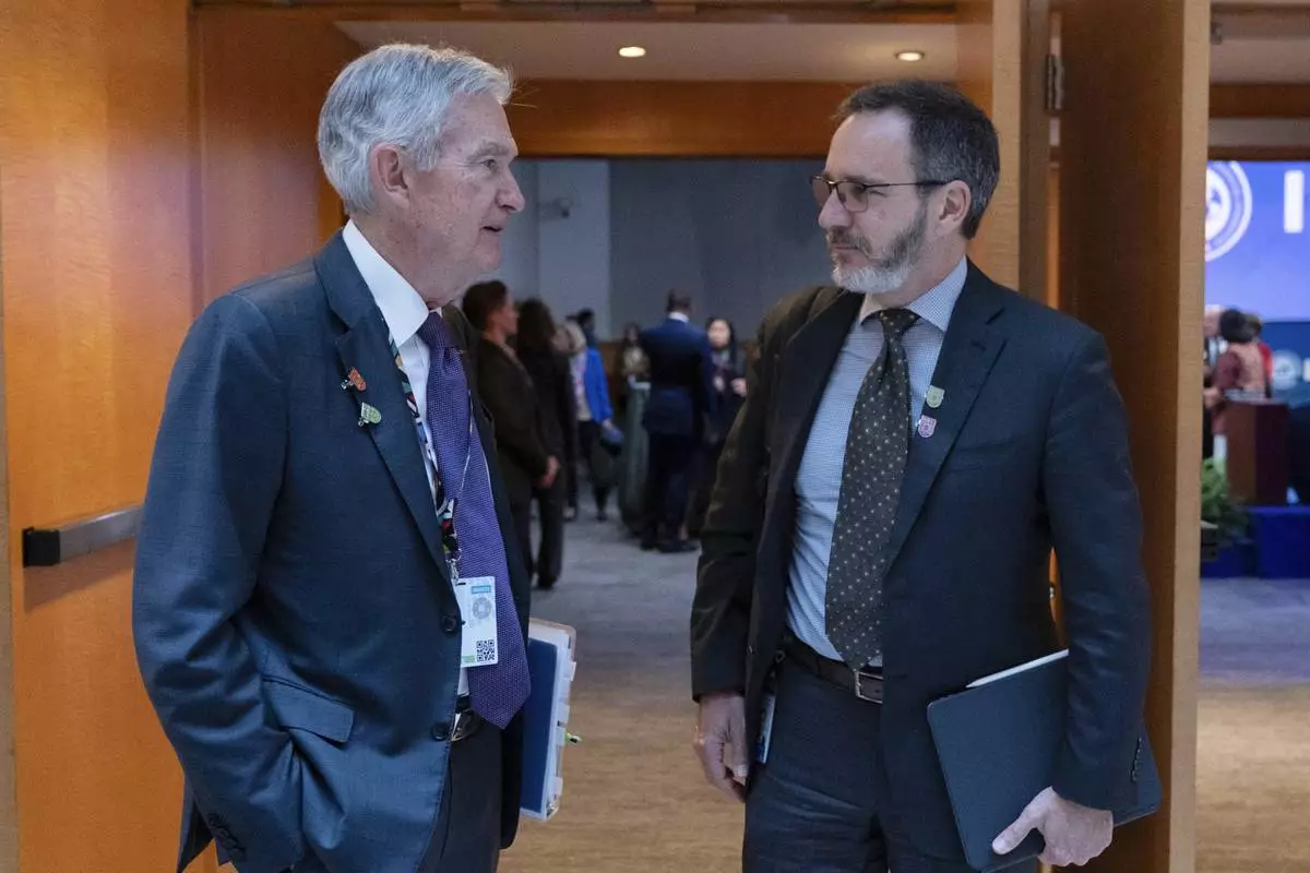 Federal Reserve board chairman Jerome Powell, left, speaks with IMF Economic Counsellor and Research Department Director Pierre-Olivier Gourinchas as they arrive for the plenary of the International Monetary and Financial Committee (IMFC) meeting, during the World Bank/IMF Spring Meetings at the International Monetary Fund (IMF) headquarters in Washington, Friday, April 25, 2025. (AP Photo/Jose Luis Magana)