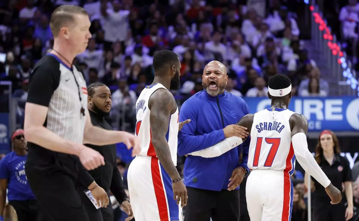 Detroit Pistons head coach J.B. Bickerstaff, second from front right, crosses the court to yell at referee Ed Malloy, left, while being held back by Pistons forward Tim Hardaway Jr., third from front right, and guard Dennis Schroder (17) during the first half of Game 6 of an NBA basketball first-round playoff series against the New York Knicks, Thursday, May 1, 2025, in Detroit. (AP Photo/Duane Burleson)