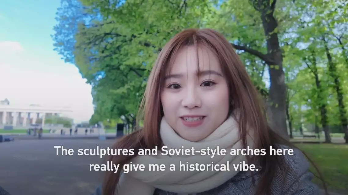 "The sculptures and Soviet-style arches here really give me a historical vibe. After I went into the Gorky Park, I also met very friendly volunteers. They gave me a ribbon like this to commemorate the Victory Day," said Lu.