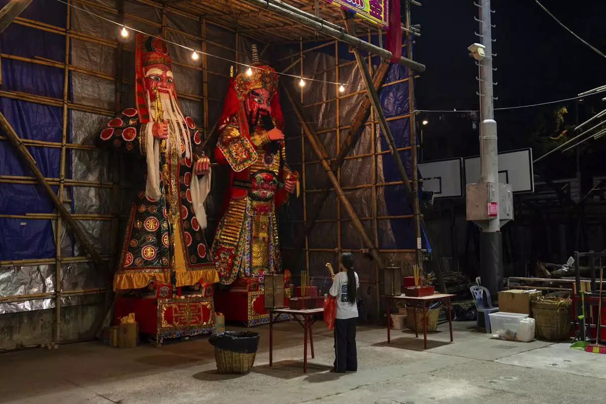 Paper offerings are displayed at a temple during the Bun Festival in Cheung Chau Island in Hong Kong, Monday, May 5, 2025. (AP Photo/Chan Long Hei)