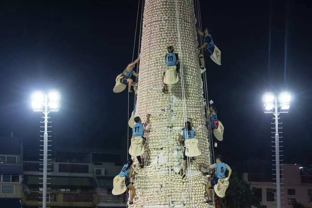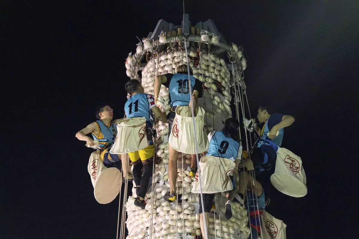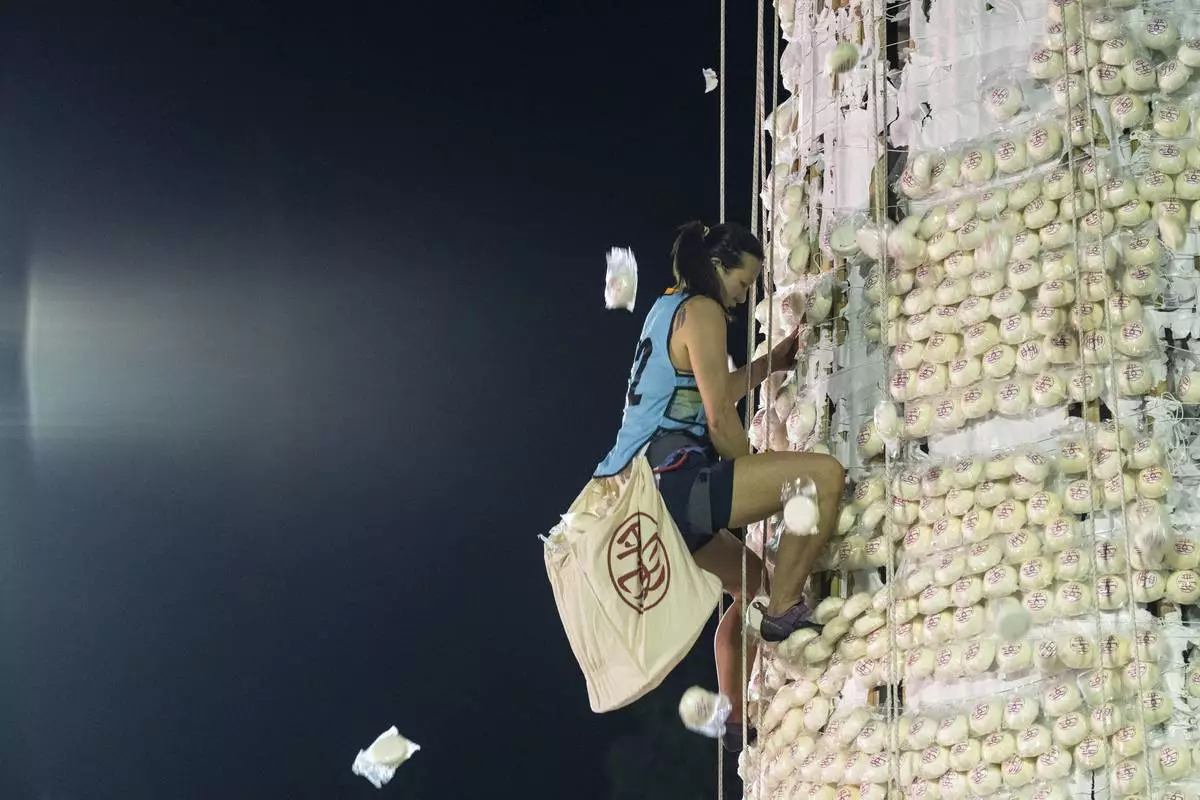 Participants climb up a tower covered with plastic buns during the Bun Festival in Cheung Chau Island in Hong Kong, Tuesday, May 6, 2025. (AP Photo/Chan Long Hei)