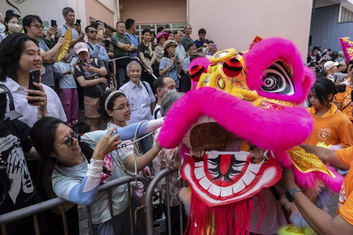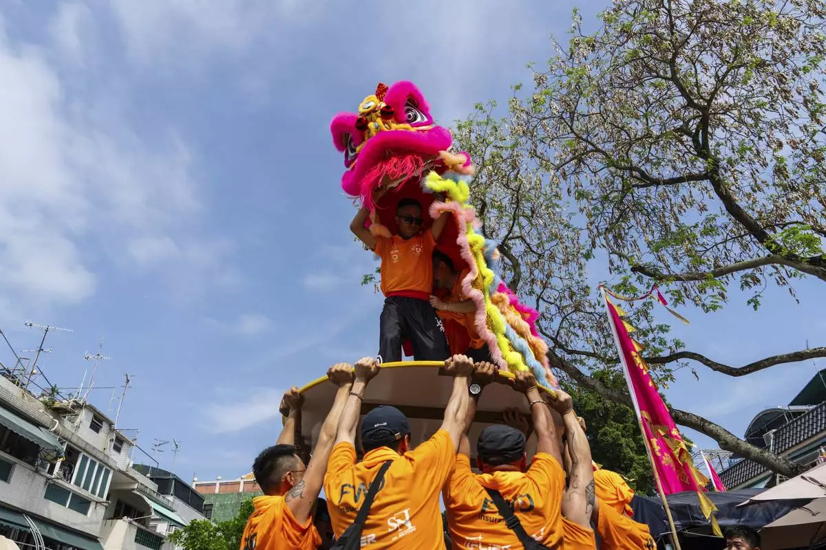 Participants perform lion dance in the Piu Sik Parade at the Bun Festival in Cheung Chau Island in Hong Kong, Monday, May 5, 2025. (AP Photo/Chan Long Hei)