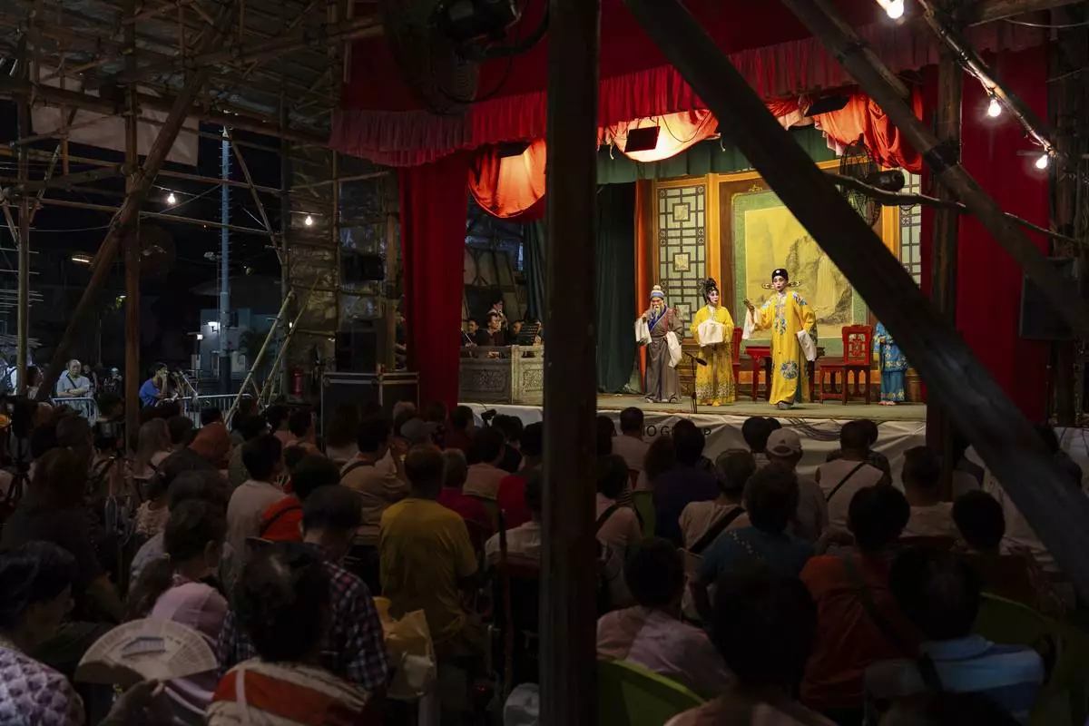 Artists perform a Chinese opera during the Bun Festival in Cheung Chau Island in Hong Kong, Monday, May 5, 2025. (AP Photo/Chan Long Hei)
