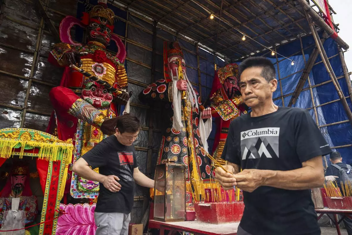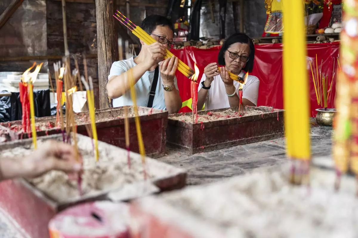 Worshippers burn incense at a temple during the Bun Festival in Cheung Chau Island in Hong Kong, Monday, May 5, 2025. (AP Photo/Chan Long Hei)
