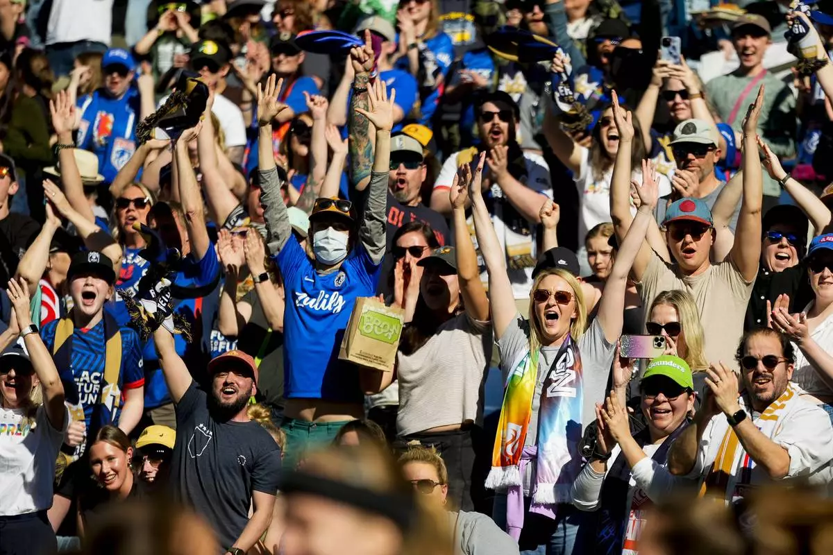 FILE - Fans celebrate after Seattle Reign forward Bethany Balcer scored on a penalty kick against the Washington Spirit during the first half of an NWSL soccer match, March 17, 2024, in Seattle. (AP Photo/Lindsey Wasson, File)