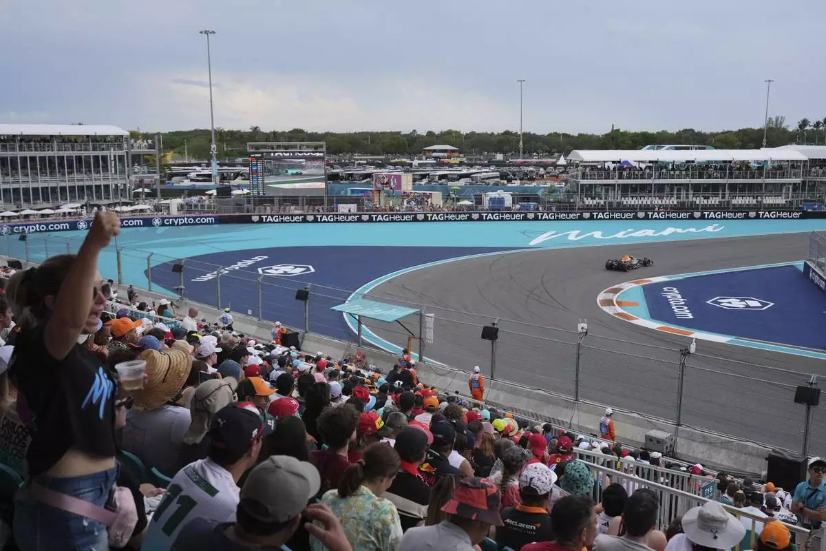 Fans cheer from the stands during the Formula One Miami Grand Prix auto race Sunday, May 4, 2025, in Miami Gardens. Fla. (AP Photo/Rebecca Blackwell)
