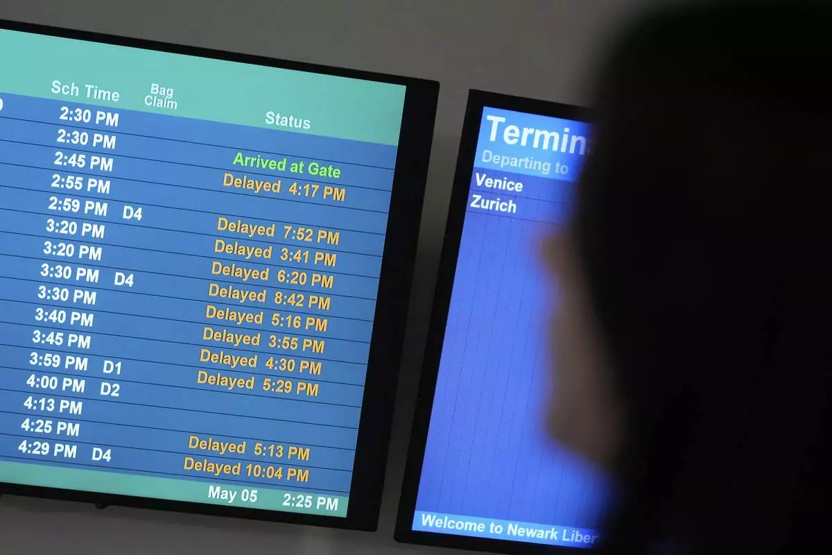 A display shows the status of flights at Newark Liberty International Airport in Newark, N.J., Monday, May 5, 2025. (AP Photo/Seth Wenig)