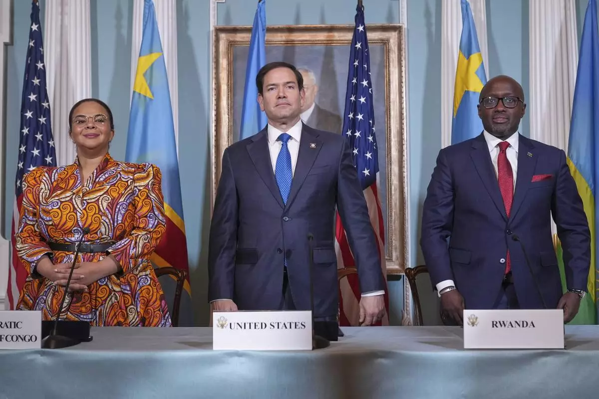 FILE - Secretary of State Marco Rubio hosts a signing ceremony in which Congo's Foreign Minister Therese Kayikwamba Wagner, left, and Rwanda's Foreign Minister Olivier Nduhungirehe, right, pledge to work toward a peace deal on Friday, April 25, 2025, at the State Department in Washington. (AP Photo/Jacquelyn Martin, File)