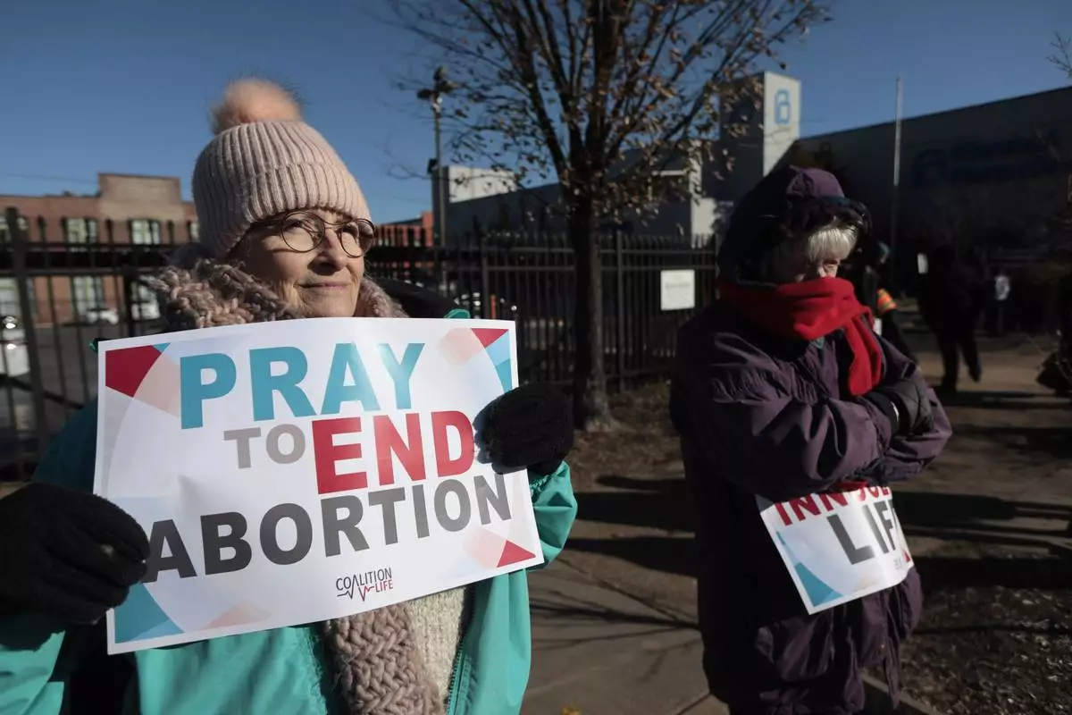 FILE - Anti-abortion protesters Jean Bullock, left, and Sue Dunn, demonstrate outside Planned Parenthood Great Rivers, Dec. 5, 2024, at in St. Louis, Mo. (Laurie Skrivan/St. Louis Post-Dispatch via AP, File)