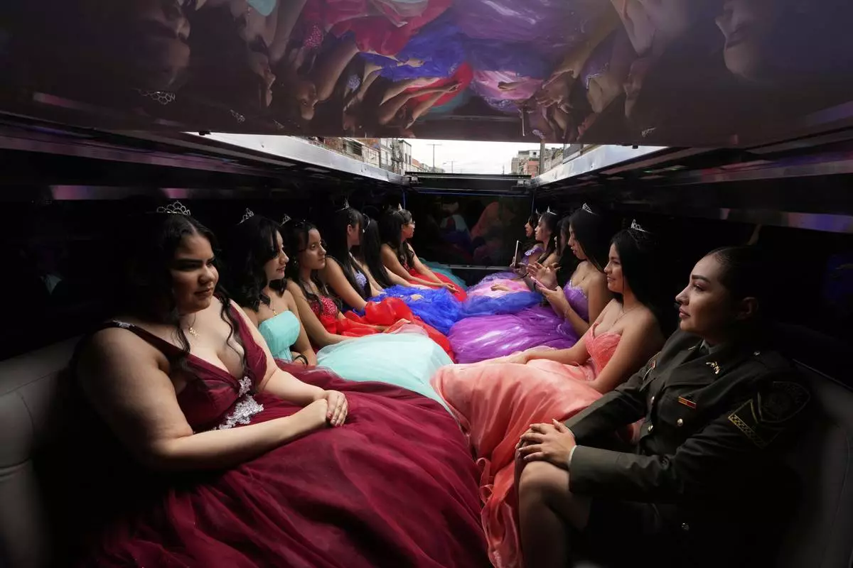 Quinceañeras ride in limousine as part of their celebration, in Bogota, Colombia, Friday, May 2, 2025. The Sueños Hechos Foundation, led by a former police officer, is hosting a quinceañera celebration on Friday for 24 disadvantaged teen girls. (AP Photo/Fernando Vergara)
