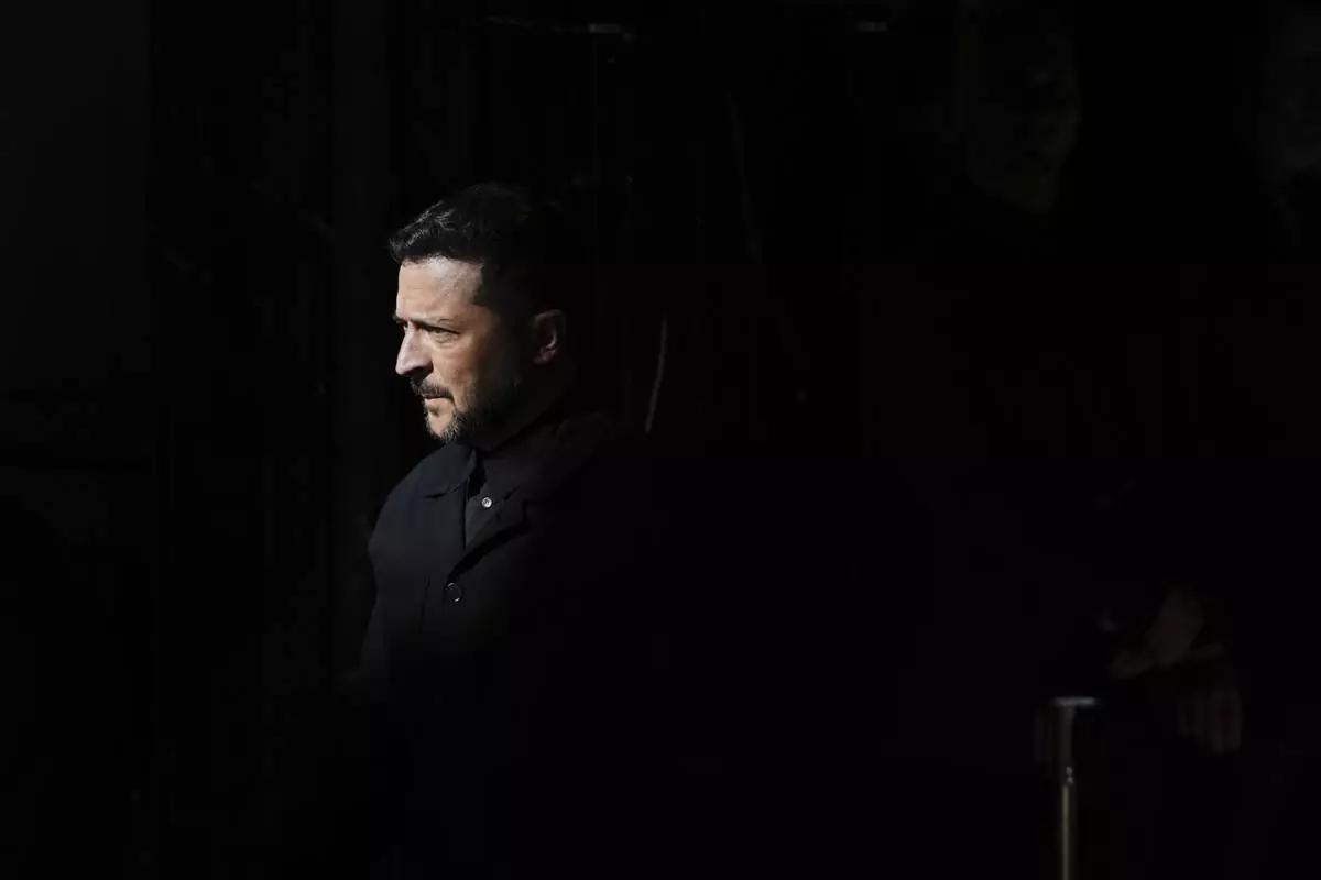 Ukraine's President Volodymyr Zelenskyy arrives for a press conference at the Prague Castle, Czech Republic, Sunday, May 4, 2025. (AP Photo/Petr David Josek)
