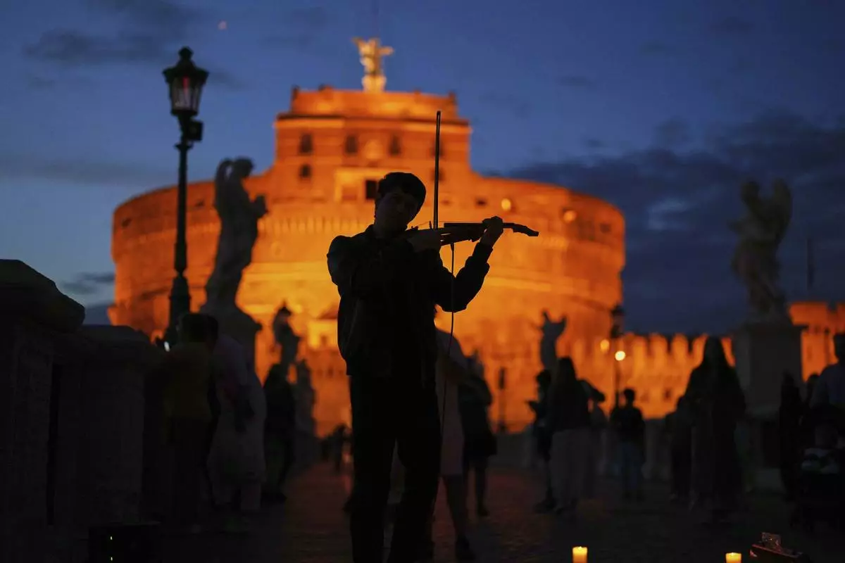 A street musician plays a violin outside the Sant'Angelo castle as the sun sets in Rome, Sunday, May 4, 2025. (AP Photo/Francisco Seco)