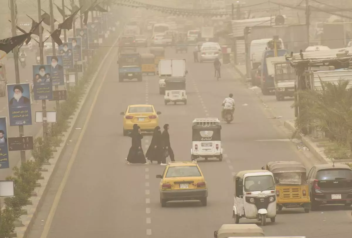 Iraqis walk through the streets during a heavy sandstorm in Baghdad, Iraq, Sunday, May 4, 2025. (AP Photo/Hadi Mizban)