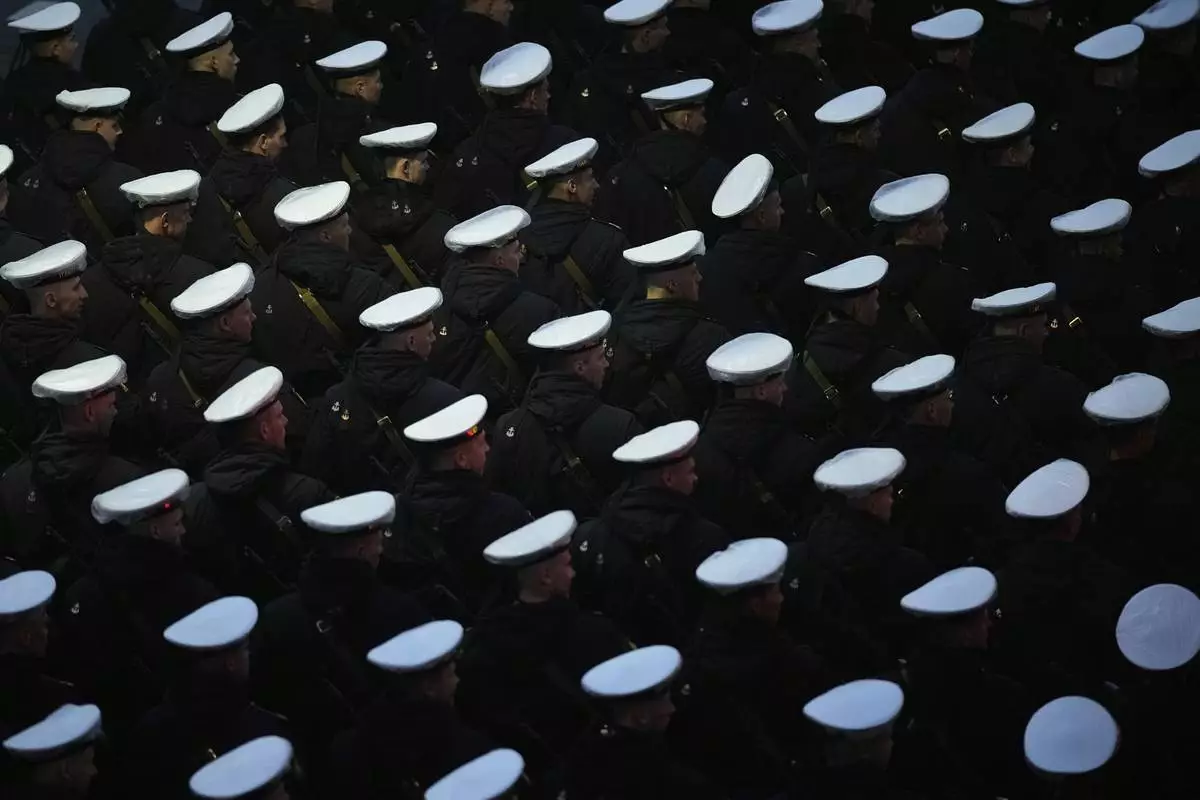 Russian servicemen march towards the Red Square prior to the Victory Day military parade rehearsal in Moscow, Russia, Saturday, May 3, 2025. (AP Photo/Pavel Bednyakov)