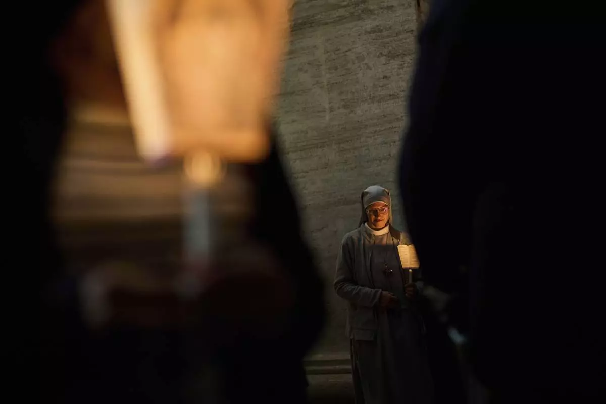 A Catholic nun attends rosary prayer and a candlelight procession with the image of Mater Ecclesiae in St. Peter's Square at the Vatican,Saturday, May 3, 2025. (AP Photo/Bernat Armangue)