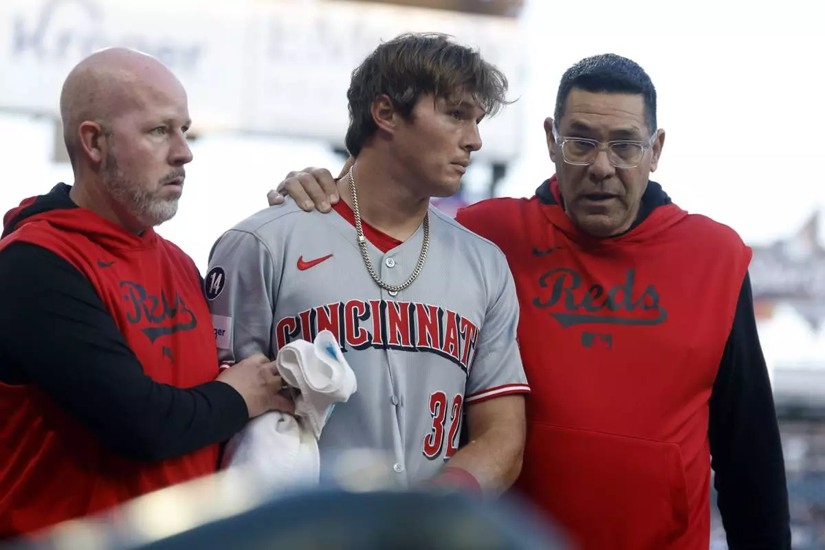 Cincinnati Reds outfielder Tyler Callihan (32) is helped off the field after colliding with the wall during the third inning of a baseball game against the Atlanta Braves, Monday, May 5, 2025, in Atlanta. (AP Photo/Butch Dill)