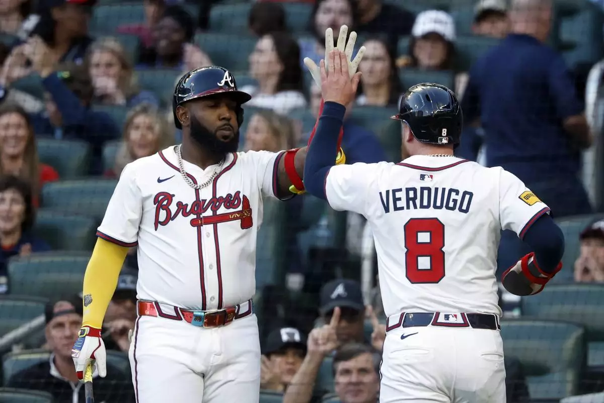 Atlanta Braves' Alex Verdugo (8) celebrates with Marcell Ozuna, left, after scoring during the third inning of a baseball game against the Cincinnati Reds, Monday, May 5, 2025, in Atlanta. (AP Photo/Butch Dill)