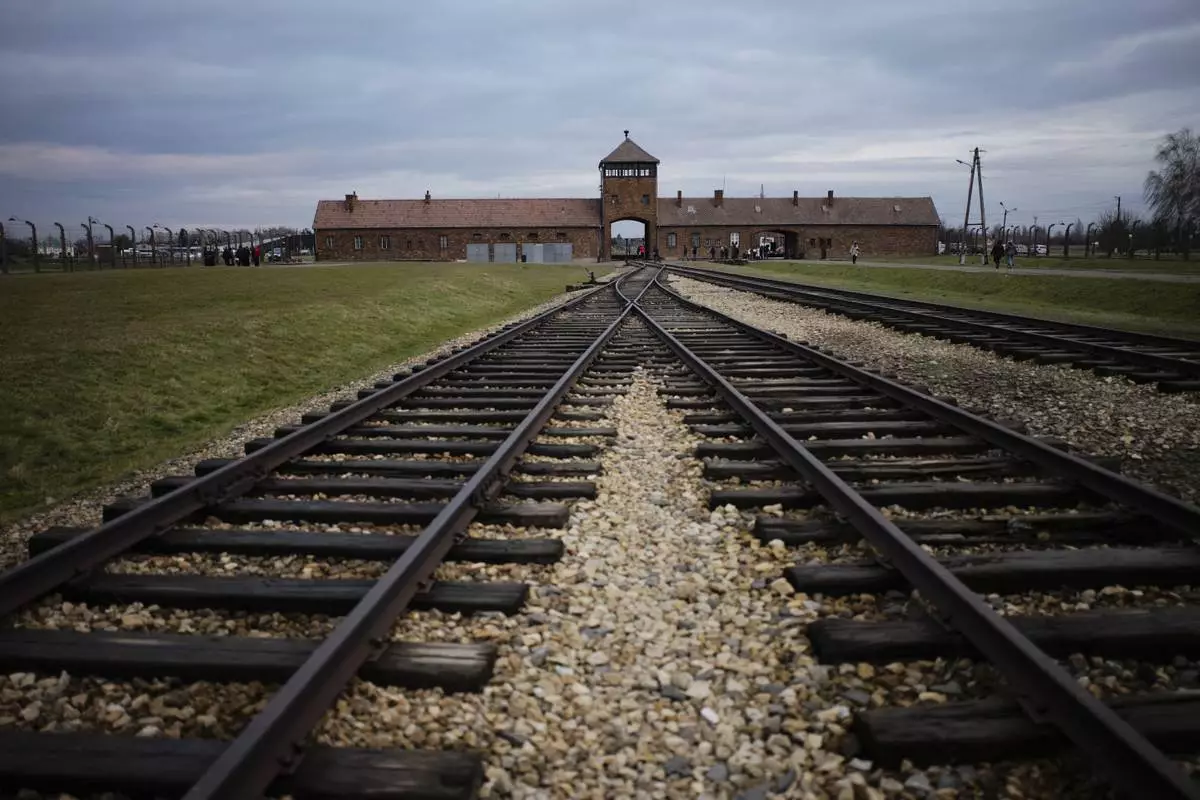 FILE - The railway tracks where people arrived to be directed to the gas chambers inside the former Nazi death camp of Auschwitz Birkenau, or Auschwitz II, are pictured in Oswiecim, Poland, on Dec. 7, 2019. (AP Photo/Markus Schreiber, File)