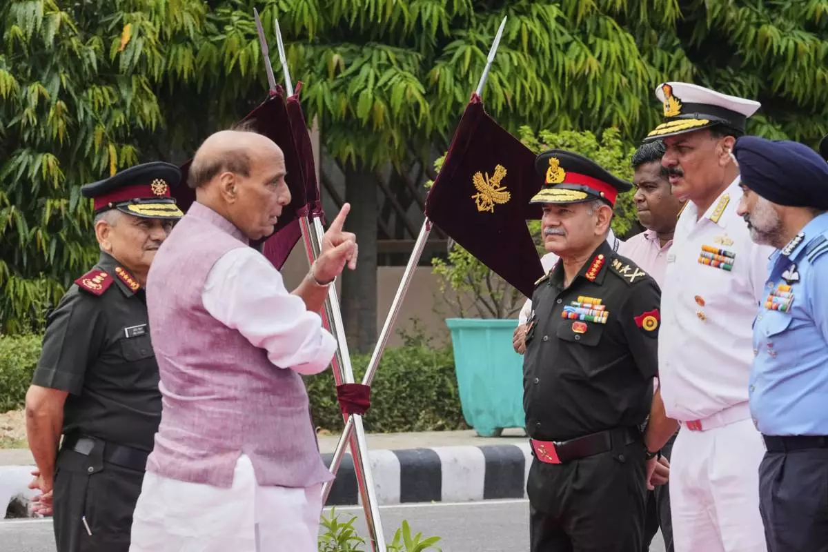 Indian Defense Minister Rajnath Singh, second left, talks to three Indian defense chiefs, Army General Upendra Dwivedi, third right, Naval Admiral Dinesh K Tripathi, second right, and Air Force Air Chief Marshal A P Singh, right, as Indian Chief of Defense Staff General Anil Chauhan, left, watches as they wait for the arrival of Japan's Defense Minister Gen Nakatani in New Delhi, India, Monday, May 5, 2025.(AP Photo/Manish Swarup)